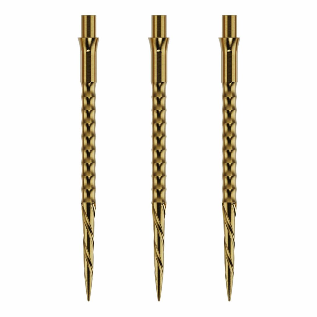 Caliburn Cserélhető darts hegyek Spiro – Ajak Nélküli – Arany hüvely típusú menetes rendszerrel ellátott, cserélhető acél hegyek, amelyeket a klasszikus újratűzés nélküli gyors és egyszerű cserére terveztek. A spirális (Spiro) profil javítja a tapadást a táblán, az arany felületkezelés pedig prémium megjelenést kölcsönöz.