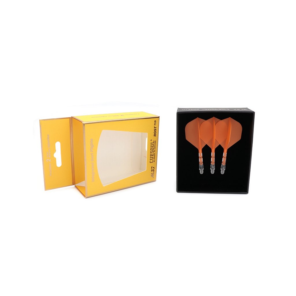 ROST T19 Small Standard Wing Integrated Dart Flight – Orange integrált, átlátszó szárral rendelkező, klasszikus Small Standard Wing (NO2) formájú nyilak. Kiegyensúlyozott repülést, stabilitást biztosítanak, és S, M és L méretben kaphatók.