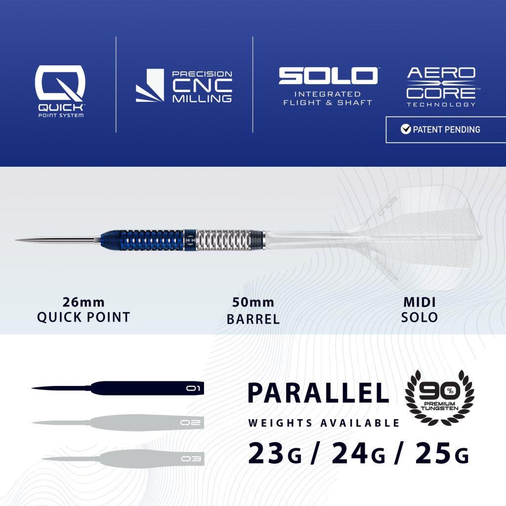 A barrel 90%-os volfrámból készült, és teljes hosszában precízen maratott hornyokkal van ellátva. Minden részlet alapos tesztelésen és fejlett gyártási folyamatokon alapul, hogy maximális érzetet biztosítson a kézben és konzisztens fogást kínáljon a különböző dobóstílusokhoz.