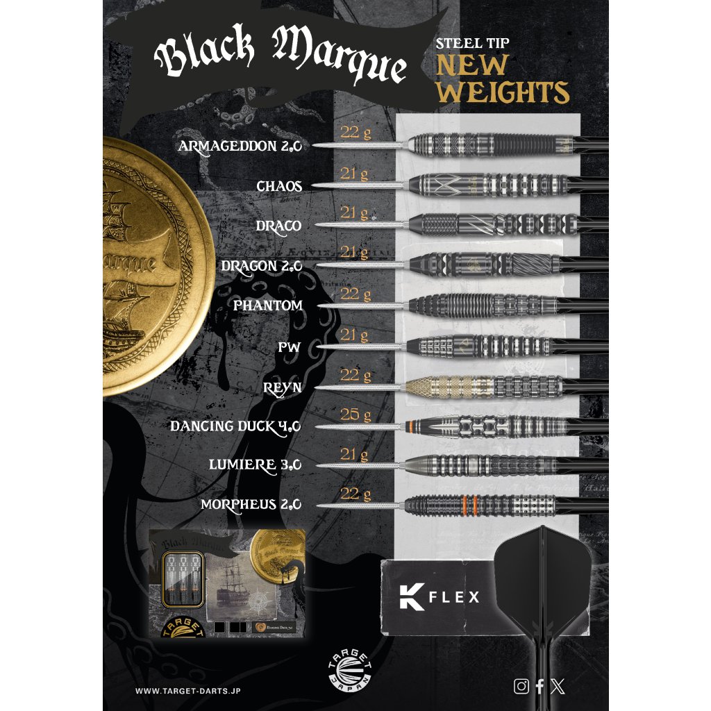 Target Japan Black Marque Lite Reyn G1 90% acél nyilak egyenes hordóval, amelyeket Reyn Agcaoli profi játékossal együttműködve terveztek. Pontos fogást, Swiss Point technológiát és kiegyensúlyozott kialakítást kínálnak a konzisztens és kontrollált dobás érdekében.