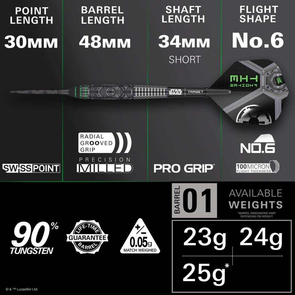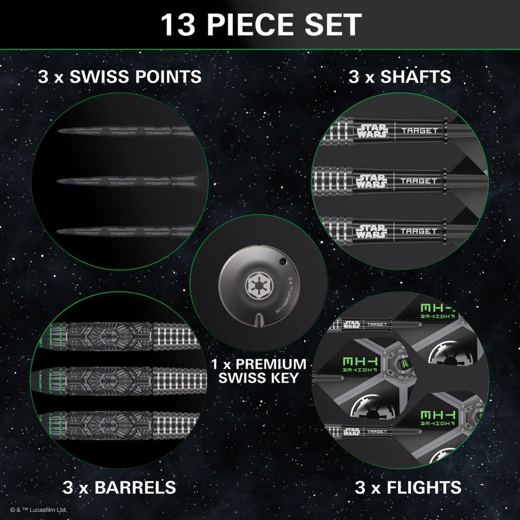 A készletet Pro Grip Star Wars szárak (rövid, 34 mm) egészítik ki, amelyek könnyű és tartós polimerből készültek, valamint a Tie Fighter részletes grafikájával ellátott Pro Ultra No.6 repülői. Ez a kombináció aerodinamikai stabilitást és jelentős vizuális megjelenést biztosít minden dobásnál.