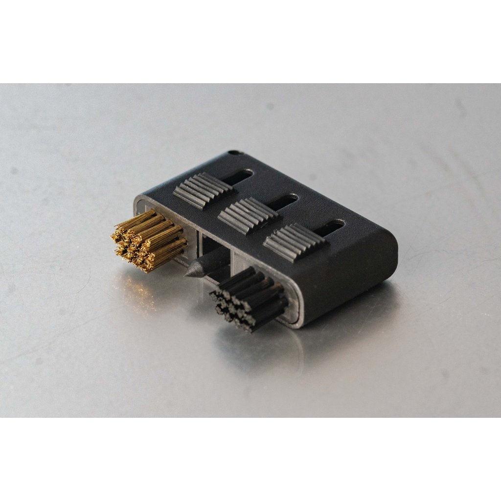 - Dupla tisztítókefe – polipropilén és réz sörték kombinációja a szárak és tollak alapos tisztításához.