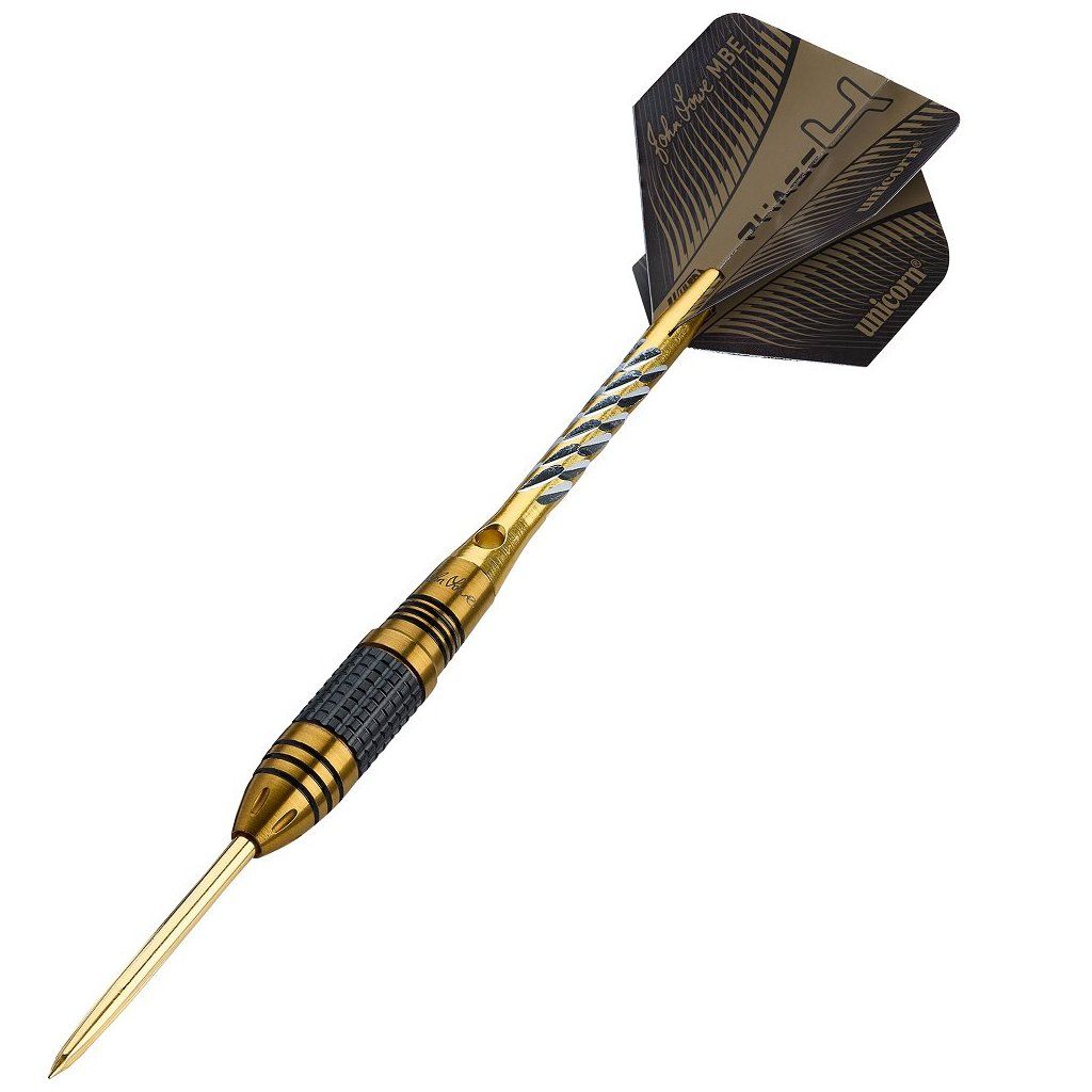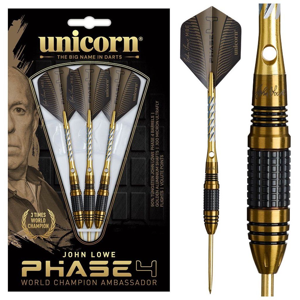 Unicorn John Lowe W.C. Phase 4 90% egy legendás dartsjátékos, John Lowe közreműködésével készült acéldarts. A hordó alak, 90% volfrám tartalom és finom markolat kiváló irányítást, kényelmes fogást és elegáns fekete-arany dizájnt biztosít.