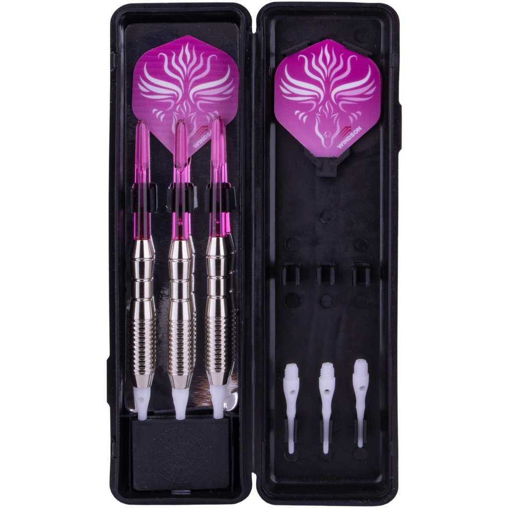 Stílusos, rózsaszín-fehér kombinációjú darts nyílkészlet, ideális elektronikus céltáblához.