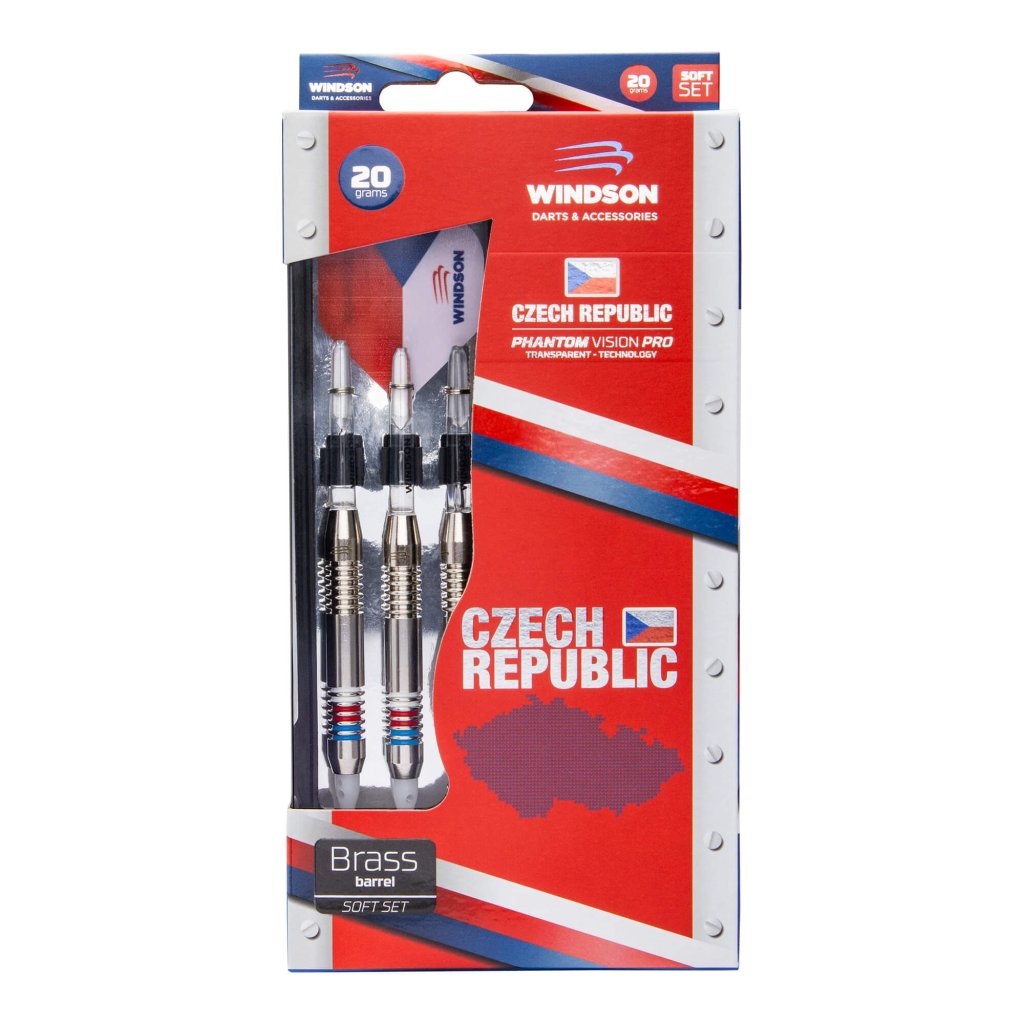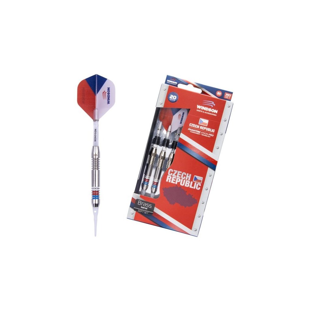 Minőségi soft tip szett CZECH SOFT 20g sárgaréz barrellel (18 g), átlátszó szárral (36 mm) és cseh zászló mintájú 100 mikronos tollakkal – ideális kezdőknek és haladóknak.