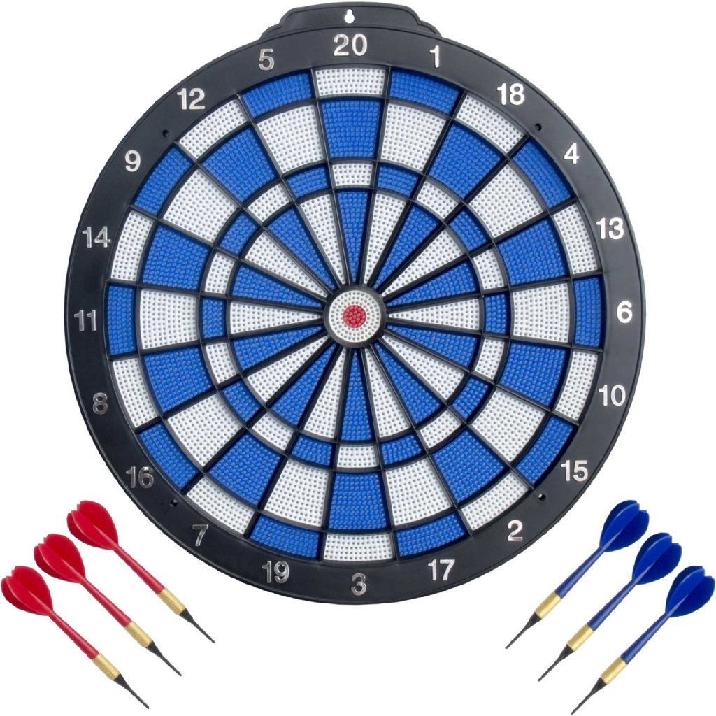 A tábla átmérője 16" (40,5 cm), és könnyen felakaszthatja, ahová szükséges. A csomag két szett puha hegyű nyilakat és 6 tartalék hegyet tartalmaz. A játékhoz csak puha hegyű nyilakat használjon, különben a tábla megsérülhet.