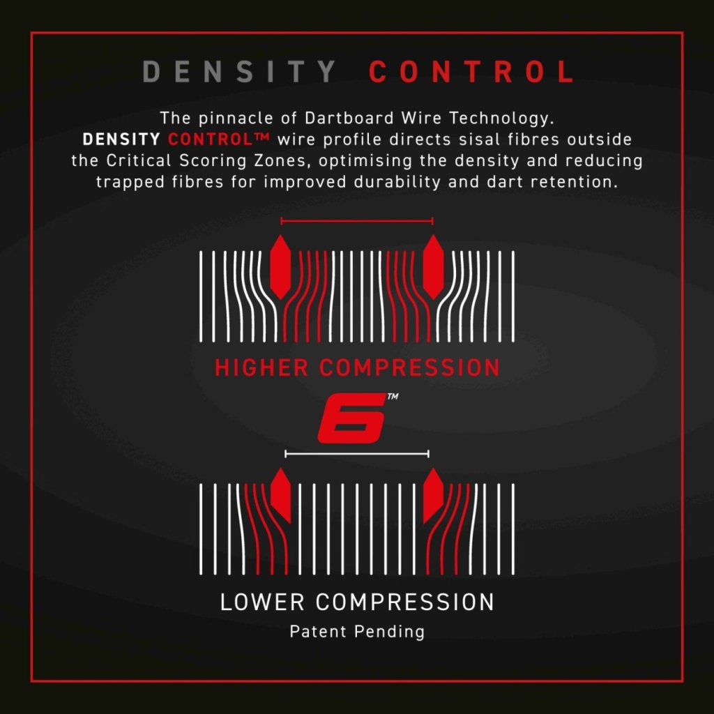 A Blade 6 modell első osztályú játékélményt, tartósságot és funkcionalitást garantál. Forradalmi dizájnja hálózati integrációval fejlett felületi anyagot használ a "Density Control™" technológiával, amely biztosítja a szálak ideális sűrűségét a nyilak hatékonyabb behatolásához a dupla, tripla és középső szektorokba.