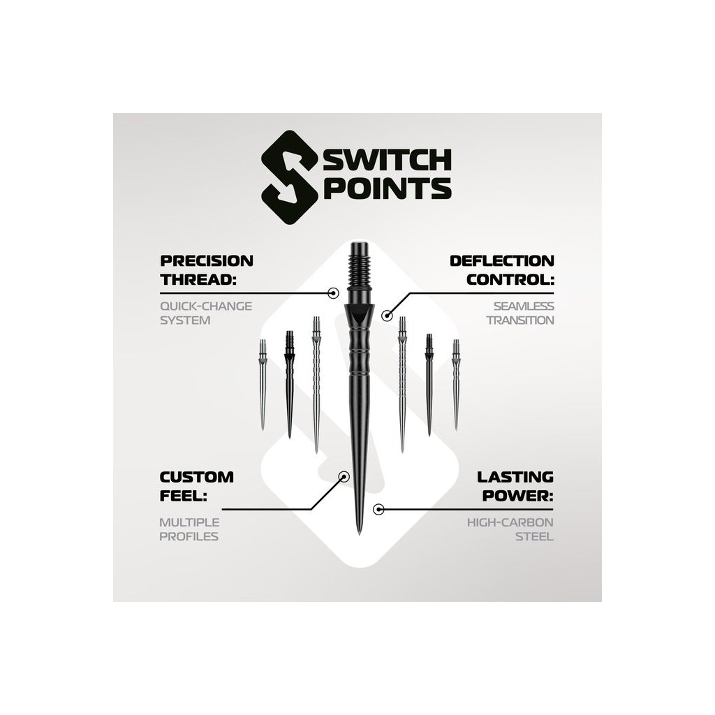A Switch rendszer lehetővé teszi a hegyek egyszerű cseréjét anélkül, hogy a teljes testet cserélni kellene. A játékosok a hegy hosszát a preferált dobóstílus és a tábla távolsága szerint választhatják meg.